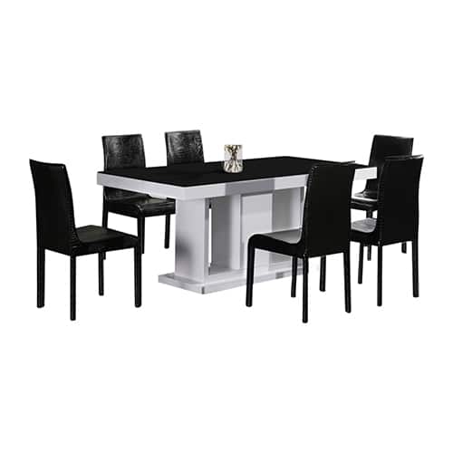 Package contents: 1×7 Pieces Dining Suite Dining Table & 6X Black Chairs in Rectangular Shape High Glossy MDF Wooden Base Combination of Black & White Colour