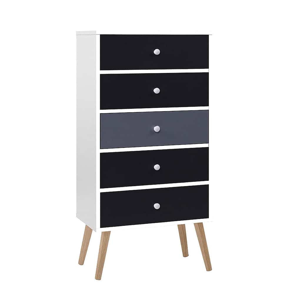 A design that is Scandinavian-inspired and while still reminiscent of decades-old influences, our Artiss 5-drawer Tallboy offers full functionality with subtle style. Made from quality particle board and a smooth paper veneer finish, the two-tone tallboy adds chic appeal to your décor and is the perfect choice to grace a dressing room, bedroom, living room or any other space in your home or establishment. The five generous-sized drawers provide ample space for all your clothing, fashion accessories, personal essentials and more. The splayed legs offer a unique, reliable stance, while the classic knob handles and smooth anti-rust metal drawer slides offer smooth, hassle-free use every time. Not sure this piece will suit your home? Take advantage of the latest 3D augmented reality technology to see it first hand – just scan the QR code on our website and decide for yourself!