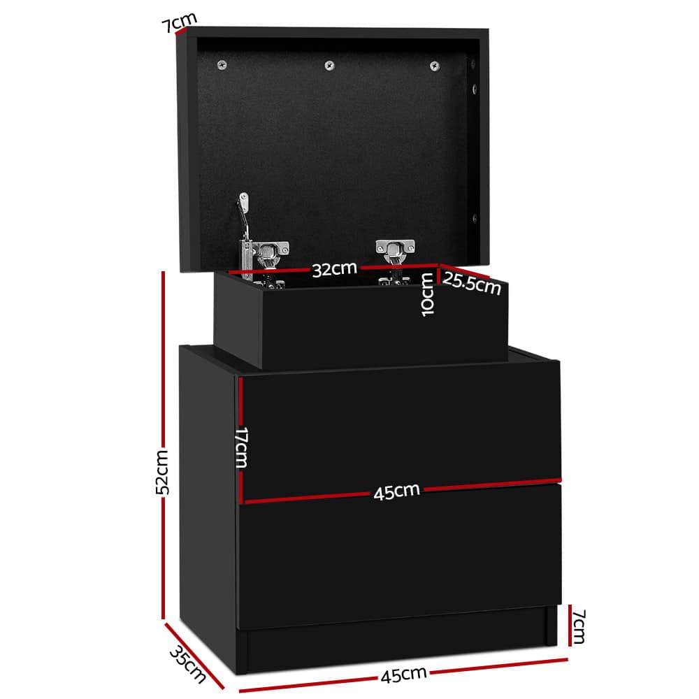 A useful bedside addition, our Artiss Bedside Table is elegant and simple with a lasting appeal. Made of 15mm thick particle board, the bedside table is sturdy and durable in every way. Two deep drawers sliding on smooth anti-rust runners provide ample storage space. There is also a top storage compartment that opens with a lift-up lid like a treasure trunk, which you can fittingly fill with your own personal treasures. Better still, the handle-free design gives it a modern vibe that stands out from the mundane. Not least, the smooth melamine finish is impeccable and easy to maintain and clean. Too good to be used only in the bedroom? Well, you can also use the bedside table as a side table with drawers to complement your contemporary home decor.