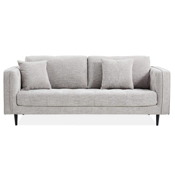 This slimline, 3-seater sofa in quartz colour is the epitome of magnificence. The French Provincial-style sofa is upholstered in Hampton fabric, a plush upholstery made of high-performance 100% polyester. The upholstery has a consistent fit and finish due to the perfect tailoring on the precision jig-cut steel frames. The sofa features a reversible back and fixed seat cushions. Piped seam detail and button tufting inside the arms and seat give the sofa a magnificent look. The sofa also includes 2x scatter cushions for additional comfort and luxury. The durable Galvanised steel frame with seating support made of HD PU foam, polyester fibre, fabric, and a high tensile spring ensures great strength for the lounge. The steel frame can withstand the weight of 300 kg. The precision-cut steel frame keeps the sofa light and incredibly durable; up to five times stronger and weighs half when compared to traditional sofa frames. Furthermore, 4 layers of seat cushioning with premium HD edge support provide excellent support for the lower body. Steel, black powder-coated legs in a tapered shape enhance the look of the sofa. The steel-core legs are directly bolted to the steel frame. So, relax, because there are no more broken or damaged legs. The sofa is easy-to assemble; only the legs need assembly. The sofa comes with a one-year warranty.